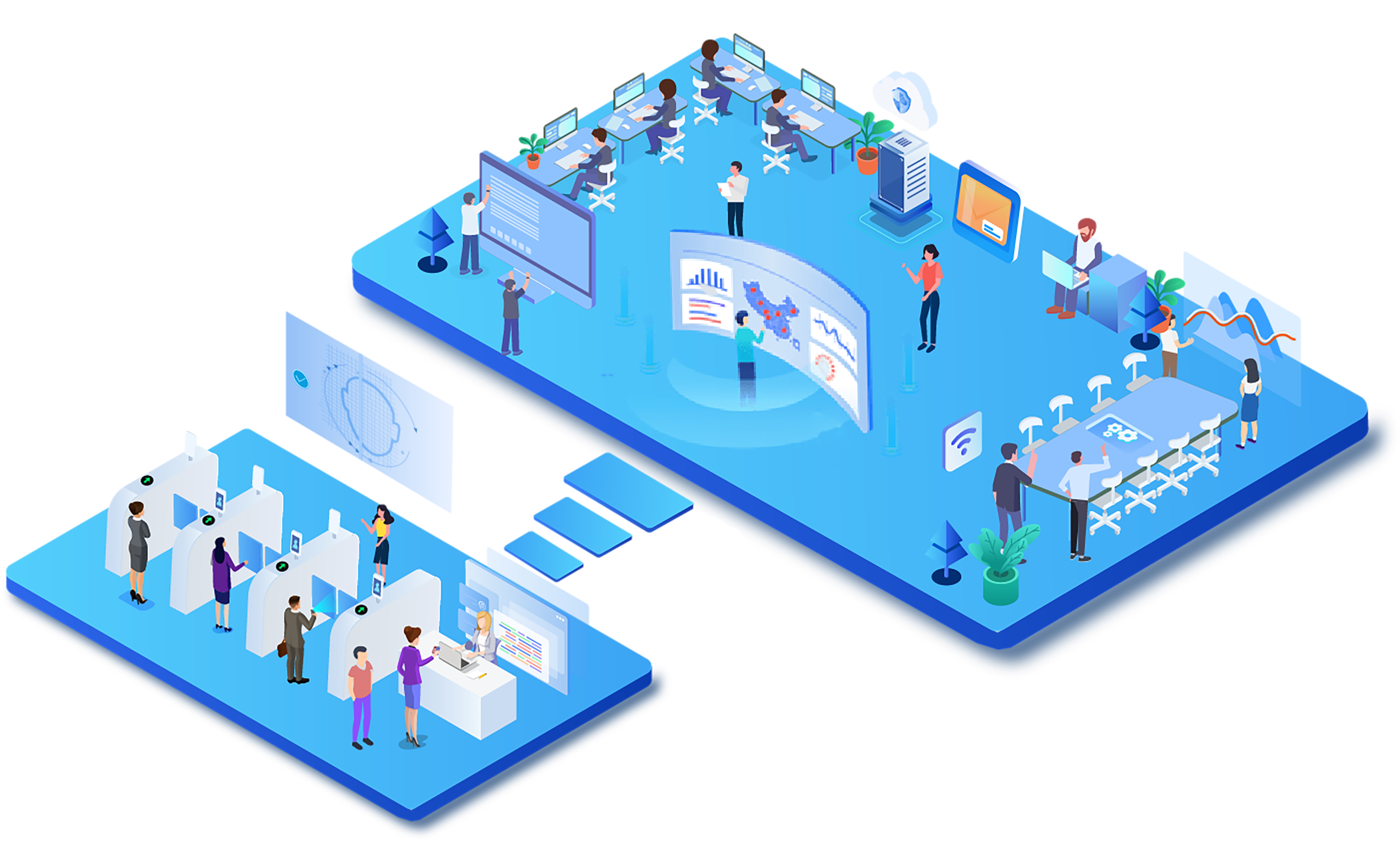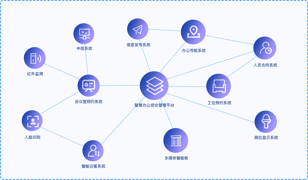 将诸多办公系统、终端设备进行集成,打造智慧办公综合管理平台,员工通过综合平台对其他系统进行统一管理。