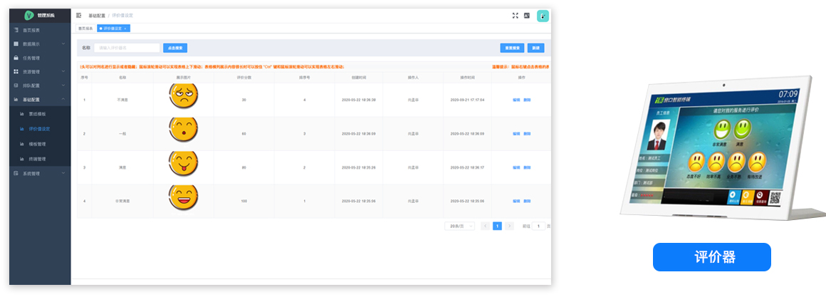 多媒体评价终端主要显示工作人员的姓名、工号等信息。当群众办事结束后,可进入到评价页面,设置四级评价标准:非常满意、满意、还可以、不满意,后台可自定义评价标准和级别,该评价终端同时兼具通知公告、图片、视频等宣传展示、岗位铭牌、天气预报、信息查询等实用功能,能够有效解决服务网点窗口存在的一系列问题,还能与排队叫号系统、信息发布系统、办公OA系统等无缝对接。